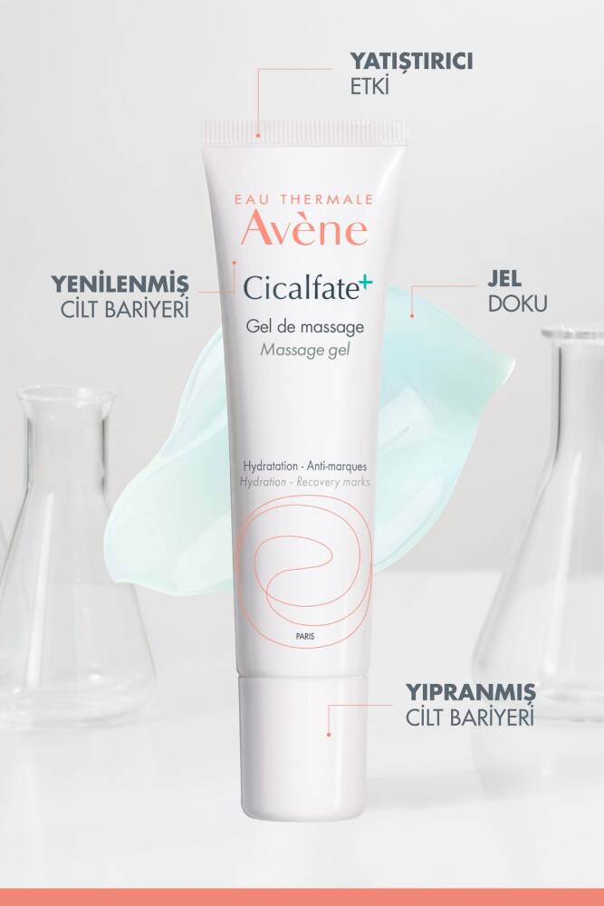 CICALFATE+ ;CİLDİN DOĞAL BARİYERİNİN YENİLENMESİNE YARDIMCI MASAJ JELİ;(30 ml);Stres, çevresel faktörler ya da genetik yapı nedeniyle cilt canlılığını ve nemini yitirebilir, cildin doğal bariyeri hasar görebilir. Cicalfate+ Cildin Doğal Bariyerinin Yenilenmesine Yardımcı Masaj Jeli, yapısı sayesinde kolay uygulanır ve cildin doğal bariyerinin güçlenmesi için canlandırıcı bir etki sunar. ;• Hassas Ciltler İçin Yatıştırıcı Etki;Cicalfate+ Cildin Doğal Bariyerinin Yenilenmesine Yardımcı Masaj Jeli, içeriğindeki Avène Termal Su, C+ Restore, Bakır – Çinko Sülfat, Hyaluronik Asit ve Silikon ile yıpranmış hassas ciltlerin yatışmasına cildin doğal bariyerinin yenilenmesine yardımcı olur.;Cilt pürüzlerinin azaltılmasını destekler, yumuşak ve konforlu bir cilt dokusu oluşturur.;• Kolay Uygulanabilen Jel Form;Cicalfate+ Cildin Doğal Bariyerinin Yenilenmesine Yardımcı Masaj Jeli, hassas ciltlerin özel bir bakıma ihtiyaç duyduğu anlarda masajı kolaylaştırır, nemlendirici jel dokusu sayesinde rahatlatıcı bir etki sunar.;Cicalfate+ Cildin Doğal Bariyerinin Yenilenmesine Yardımcı Masaj Jeli’ni Kimler Kullanabilir?;Cicalfate+ Cildin Doğal Bariyerinin Yenilenmesine Yardımcı Masaj Jeli, onarıma ihtiyaç duyan ve yatıştırıcı etkiye ihtiyaç duyan tüm cilt tipleri için uygundur. ;Cicalfate+ Cildin Doğal Bariyerinin Yenilenmesine Yardımcı Masaj Jeli Nasıl Kullanılır?;Cilde masaj yaparak günde 2 kez uygulayın. Yetişkinler ve çocuklar için kullanılabilir. ;Cicalfate+ Cildin Doğal Bariyerinin Yenilenmesine Yardımcı Masaj Jeli Ürün İçeriği;Avène Termal Suyu; yatıştırıcı, rahatlatıcı ve ferahlatıcı etki.;C+ Restore; Avène Termal Suyundan elde edilen patentli postbiyotik aktif bileşen. Cilt onarımını destekler.;Hyaluronik Asit, Hasarlı cilt yüzeyinde nemlendirmeyi sağlar.;Bakır – Çinko Sülfat; antibakteriyal kompleks, bakteri üreme riskini sınırlar.;Silikon; koruyucu etki sunar.