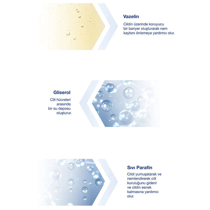 İçeriğinde bulunan Gilserol, Vazelin ve Sıvı Parafin cilt hücrelerinin tamamını derinlemesine nemlendirir. Vazelin, ciltteki kuruluğun giderilmesine yardımcı olurken Gliserol cildi nemlendirir ve doğal parlaklığına kavuşmasına destek olur. Sıvı Parafin,ise cildin nemli görünümüne katkı sunar.
