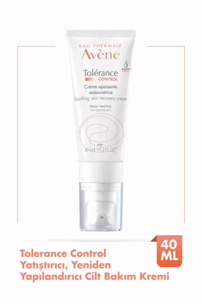 "Tolerance Control Yatıştırıcı ve Yeniden Yapılandırıcı Cilt Bakım Kremi 40 ml, hassas ve reaktif ciltler için özel olarak geliştirilmiş bir nemlendiricidir.;Hassas ciltlerin yatışmasına ve rahatlamasına destek olur.;Alerjik ve reaktif ciltlerde rahatlama sağlar.;30 saniyede yatıştırıcı etki sağlar*.;24 saat boyunca nemlendirme etkisi sunar**.;48 saat içinde cilt bariyerini yenilemeye destek olur***.;D-Sensinose™ patentli post-biyotik aktif içerik ile cildi rahatlatır.;Avène Termal Su içeriği sayesinde cildi yatıştırır ve nem dengesini korur.;Skualen içeriği ile cildi yoğun bir şekilde nemlendirir.;%98 doğal içerik ile hassas ciltler için geliştirilmiştir.;Günlük cilt bakım rutininin bir parçası olarak kullanılabilir.;Sabah ve akşam temiz cilde uygulanması önerilir.;Cildin yatışmasına ve tahriş hissinin azalmasına yardımcı olur.;Hafif ve hızlı emilen yapısı sayesinde ciltte yağlı his bırakmaz.;Hassas ciltlerin günlük bakım ihtiyacını karşılar.;*Kullanıcı memnuniyet testi, 25 kullanıcı, Pierre Fabre Klinik Veriler;**Kullanıcı memnuniyet testi, 26 kullanıcı, Pierre Fabre Klinik Veriler;***Farmakolojik çalışmalar, epidermis üzerinde su stresine karşı koruyucu etkinlik değerlendirmesi, Pierre Fabre Klinik Veriler"